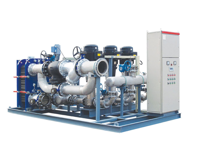 換熱機組的構成及工作原理換熱機組是集成板式換熱器、循環泵、補水泵、電控柜、溫控裝置、各種傳感器、熱量計、溫度計、壓力表、管路和閥1門等于- -體,并組裝在公共底座上的熱交換成套組合裝置。一次側熱源(蒸汽、高溫水等),經過除污器過濾后,進入板式換熱器與二次側循環水進行熱交換,然后返回一次側回水管網。二次側循環水經過除污器過濾、循環泵加壓后,進入板式換熱器與一次側熱源進行熱交換,然后進入二次側供水管...